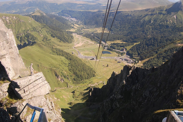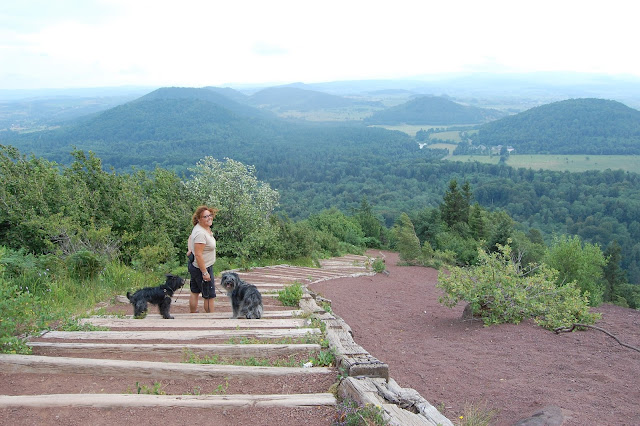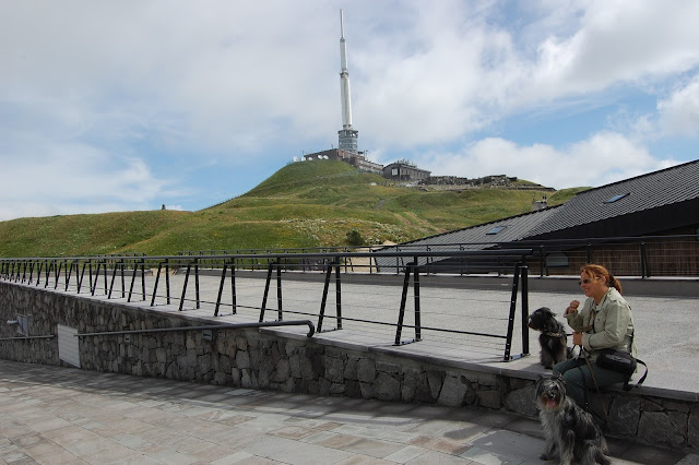 Las perras muy bien y si ningún recelo además, tuvimos suerte y el tren no iba muy lleno. Una vez arriba, ¿qué puedo decir? unas vistas espectaculares, es una autentica gozada aunque el día se nos iba nublando cada vez un poco mas, Se dice que en los días claros desde arriba se divisa una octava parte de Francia. Yo no se si tanto pero desde luego se ven muchos de los volcanes de Auvernia. Estamos en el Volcán mas antiguo y mas famoso. Los romanos construyeron allí un templo dedicado a Mercurio pero no pudimos visitarlo.