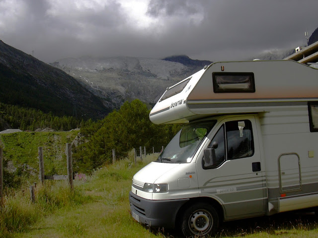 Entramos en el camping Gotthard, bueno lo de entrar es un eufemismo, el camping no deja de ser una campa con una cinta de plástico que delimita el sitio. Y servicios de camping, los aseos de un teleférico  y poco mas. Al menos estaba llano, que ya era algo, la altitud a la que se encuentra, 1.444 metros nos hacia pensar que haría menos viento que en la cumbre del Sustenpass pero no era cierto.  Pasar la noche en ese prado llamado camping, junto a las cabinas de un teleférico nos costo 26 francos. Una vez entramos a la caseta de obras que hacia las veces de recepción sabia que la cosa no iba a terminar muy bien. La mujer que nos atendió nos dio la tarifa. En ella se incluían 3 francos por simplemente estar. Después de mucho discutir con ella cedimos y pagamos los 26 francos. _ 2 por electricidad, 12 por dos personas, 9 por la autocaravana y 3 por que ella lo valía.  Quiero pensar que el lugar lo merecería, nosotros no pudimos ver nada a la llegada,  ni nada al día siguiente cuando decidimos partir. La lluvia y el viento nos había acompañado toda la noche. Al levantarnos y  tras un largo paseo con Tejo  nos decidimos por seguir ruta.