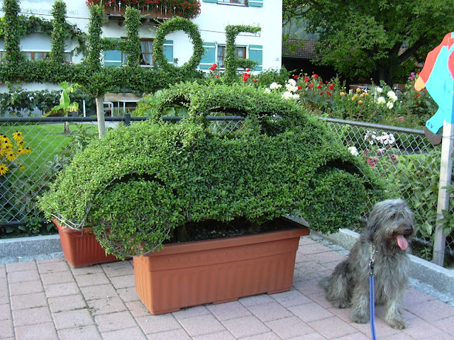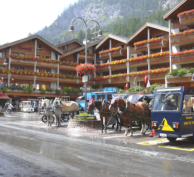 Al levantarnos nos ponemos en ruta y nos incorporamos a la autopista A9 y nos desviamos hacia Täsch y vamos directos al camping que lleva el nombre de la localidad, no tiene perdida porque está situado junto a la estación de trenes que suben a Zermatt y por cierto, no está vallado. Nos instalamos y vemos las tarifas 50 francos suizos/dia.  El dueño hablaba perfectamente español y estaba realizando una magnifica maqueta de los Alpes.  Después de comer y dar una vuelta grande a nuestro perro Tejo (un precioso gos d’atura català) nos cogemos las bicis y nos vamos a Zermatt, la carretera tiene un firme horrible y aunque las cuestas son duras, al menos dos de ellas, es recomendable el paseo. En  Zermatt está prohibido el uso del coche, solo se puede acceder andando, en bicicleta, en tren cremallera. En la localidad alpina circulan coches de caballos y también coches eléctricos. Pero, esta pequeña ciudad bien merece tomarse en ella un café.