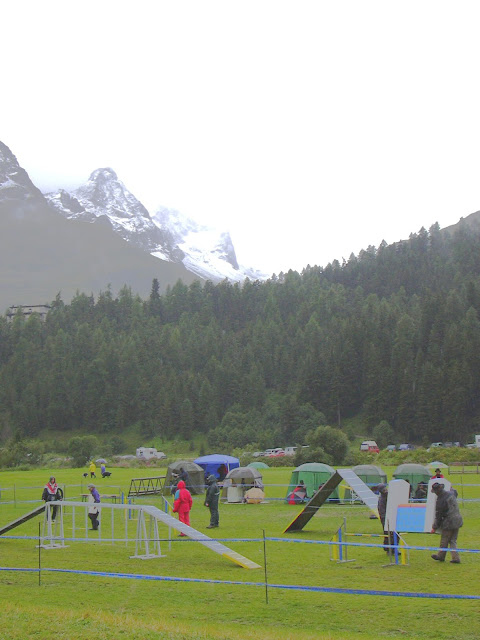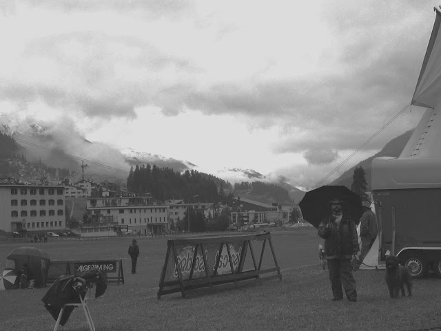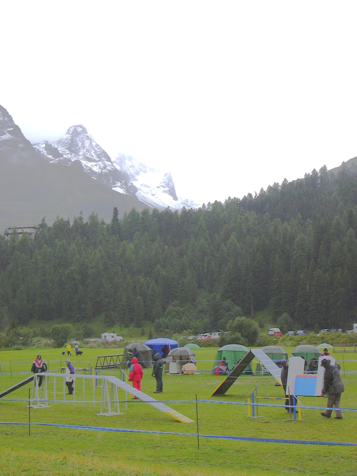 Después del paseo con nuestro perro nos fuimos a buscar donde se realizaba al día siguiente una competición de agility. Nos acercamos y preguntamos si se puede participar y al decirnos que si,  hacemos la inscripción para el día siguiente.  Tejo no se espera la alegría que va a tener cuando se encuentre con una pista de agility. Pasamos una noche con viento y lluvia, y nos tuvimos que levantar a poner la calefacción.  Al levantarnos al día siguiente descubrimos que todas las cumbres que rodean St. Moritz estan nevadas. Todo está montado para un día de competición. Hay muchos competidores italianos y alemanes y nos resulto muy fácil todo porque nos ayudaron desde la organización. Eso si, Tejo se elimino ambas mangas.