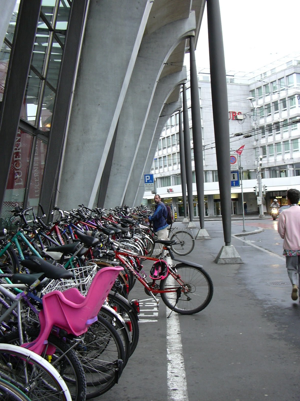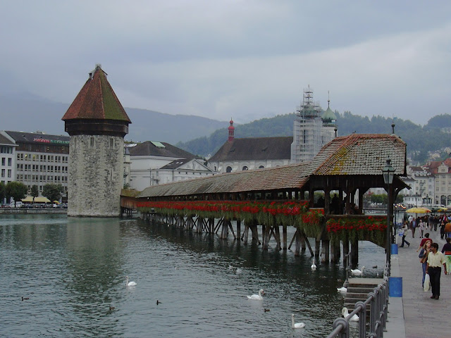 Al llegar a Lucerna aparcamos junto al Lago de los 4 Cantones, cogemos las bicis y nos vamos a ver la ciudad. Llueve y llueve pero que le vamos a hacer estamos en Suiza por eso todo es tan verde, o no? Lo que no entendí es como Ruben se acordaba de donde habíamos aparcado nuestras bicicletas. Había miles por toda la ciudad.