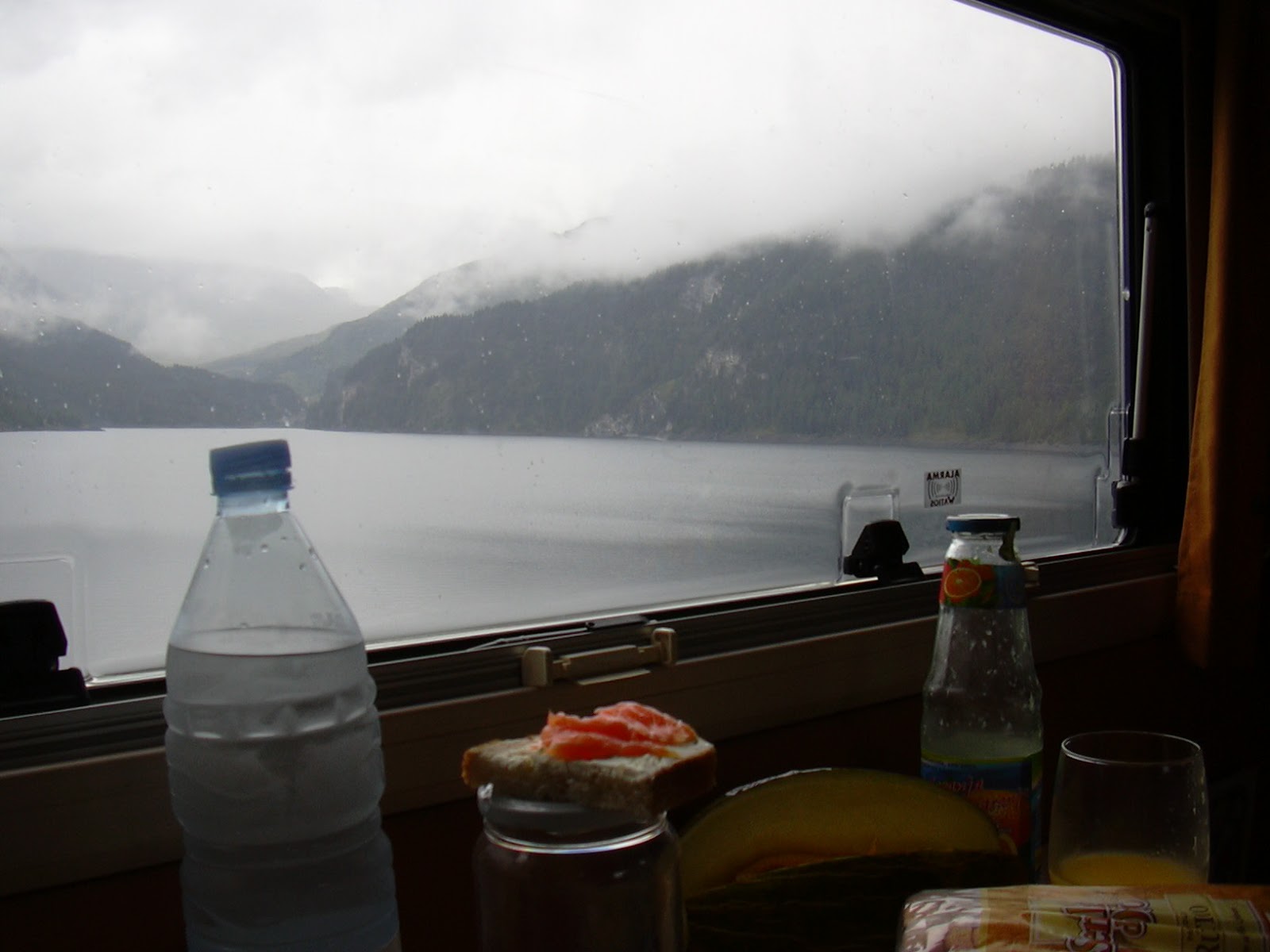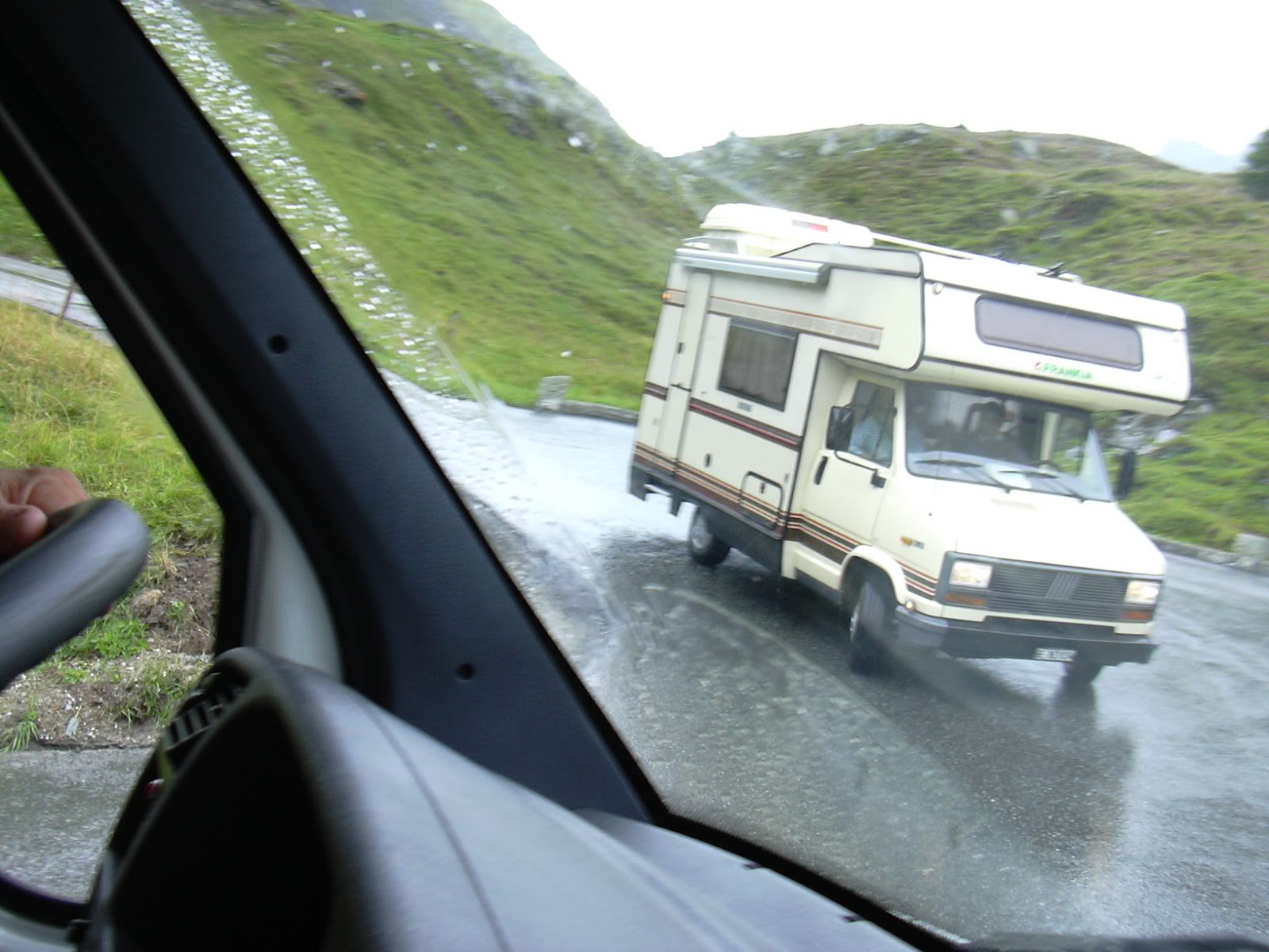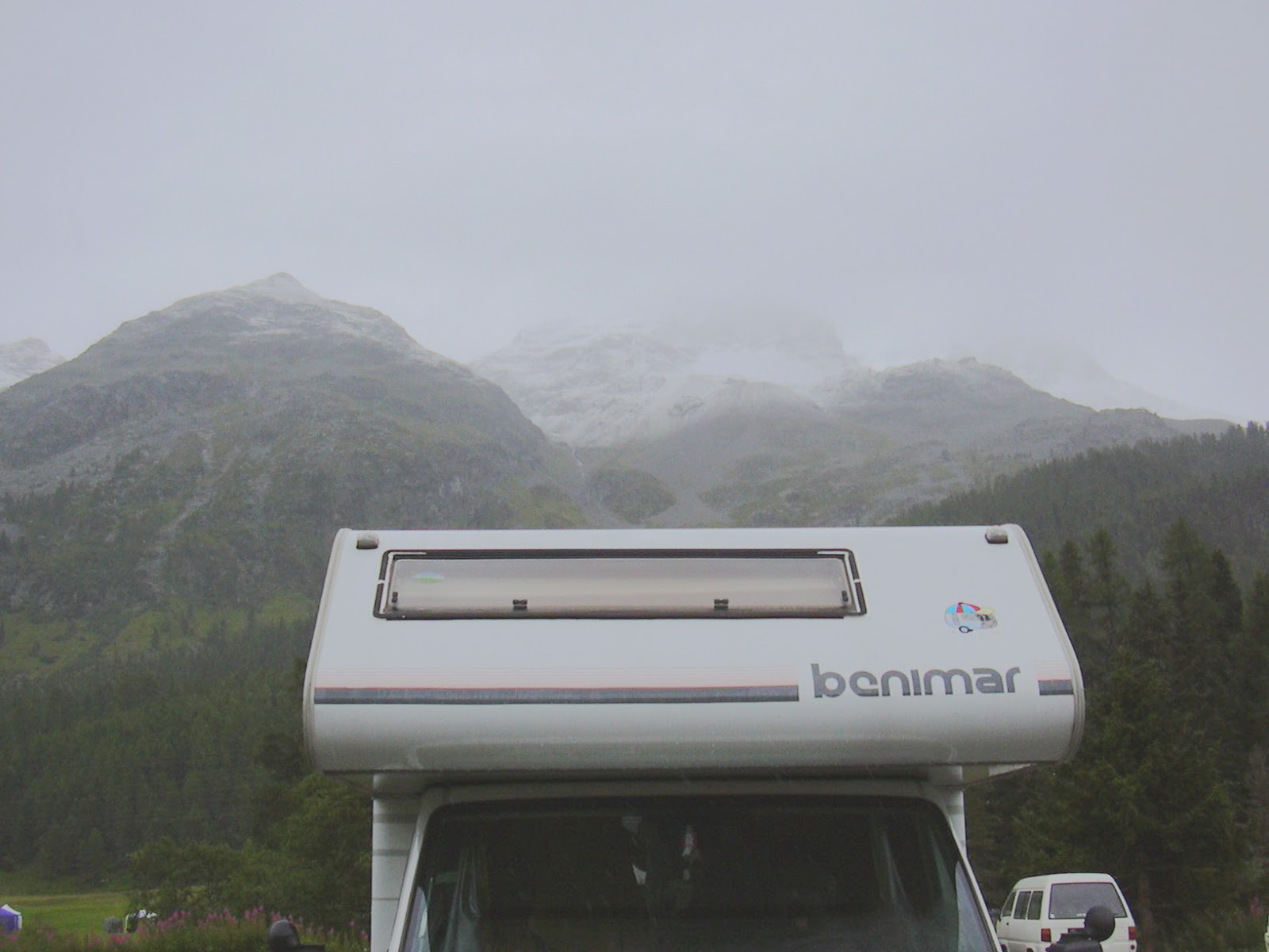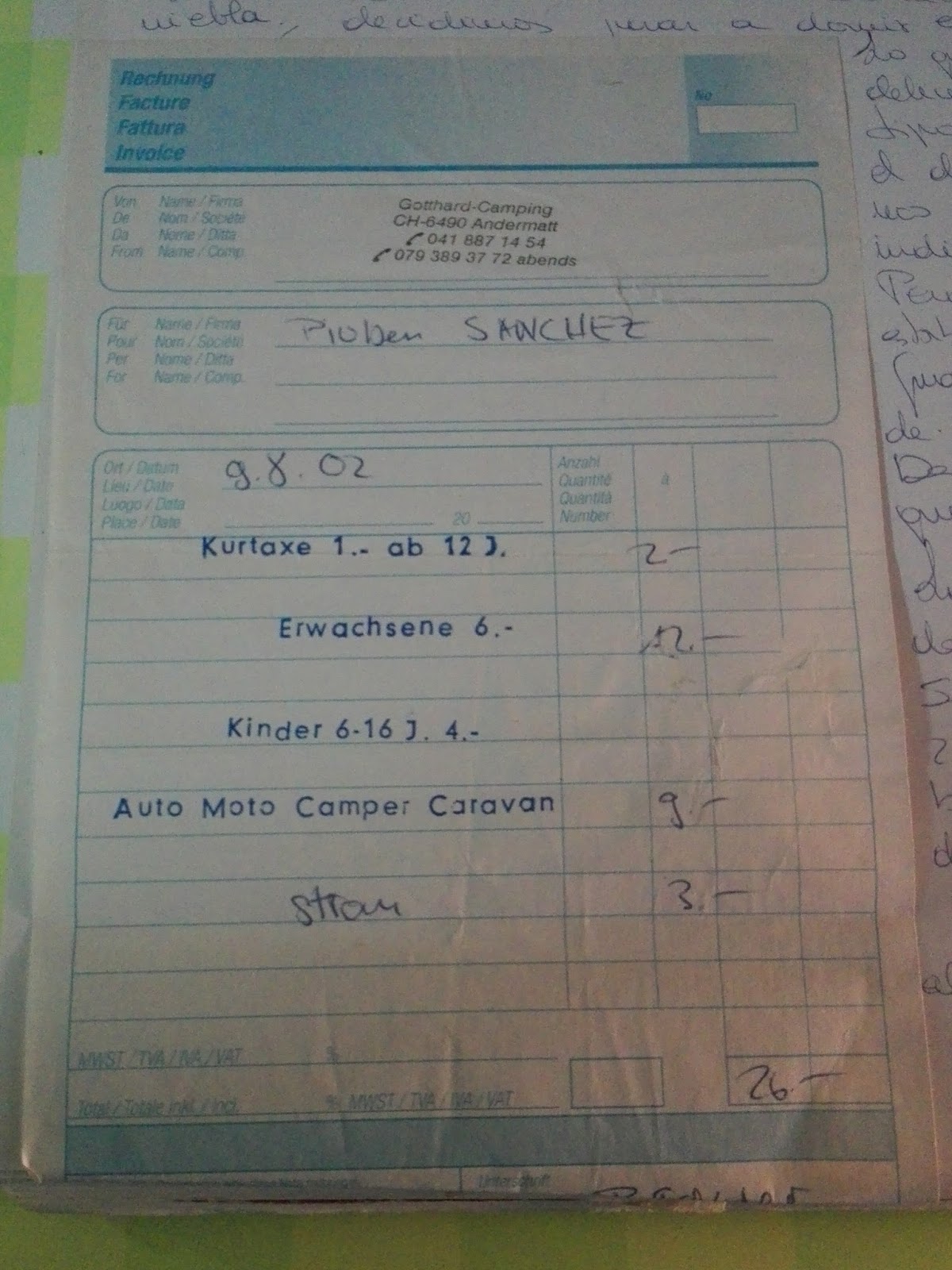 Entramos en el camping Gotthard, bueno lo de entrar es un eufemismo, el camping no deja de ser una campa con una cinta de plástico que delimita el sitio. Y servicios de camping, los aseos de un teleférico  y poco mas. Al menos estaba llano, que ya era algo, la altitud a la que se encuentra, 1.444 metros nos hacia pensar que haría menos viento que en la cumbre del Sustenpass pero no era cierto.  Pasar la noche en ese prado llamado camping, junto a las cabinas de un teleférico nos costo 26 francos. Una vez entramos a la caseta de obras que hacia las veces de recepción sabia que la cosa no iba a terminar muy bien. La mujer que nos atendió nos dio la tarifa. En ella se incluían 3 francos por simplemente estar. Después de mucho discutir con ella cedimos y pagamos los 26 francos. _ 2 por electricidad, 12 por dos personas, 9 por la autocaravana y 3 por que ella lo valía.  Quiero pensar que el lugar lo merecería, nosotros no pudimos ver nada a la llegada,  ni nada al día siguiente cuando decidimos partir. La lluvia y el viento nos había acompañado toda la noche. Al levantarnos y  tras un largo paseo con Tejo  nos decidimos por seguir ruta.