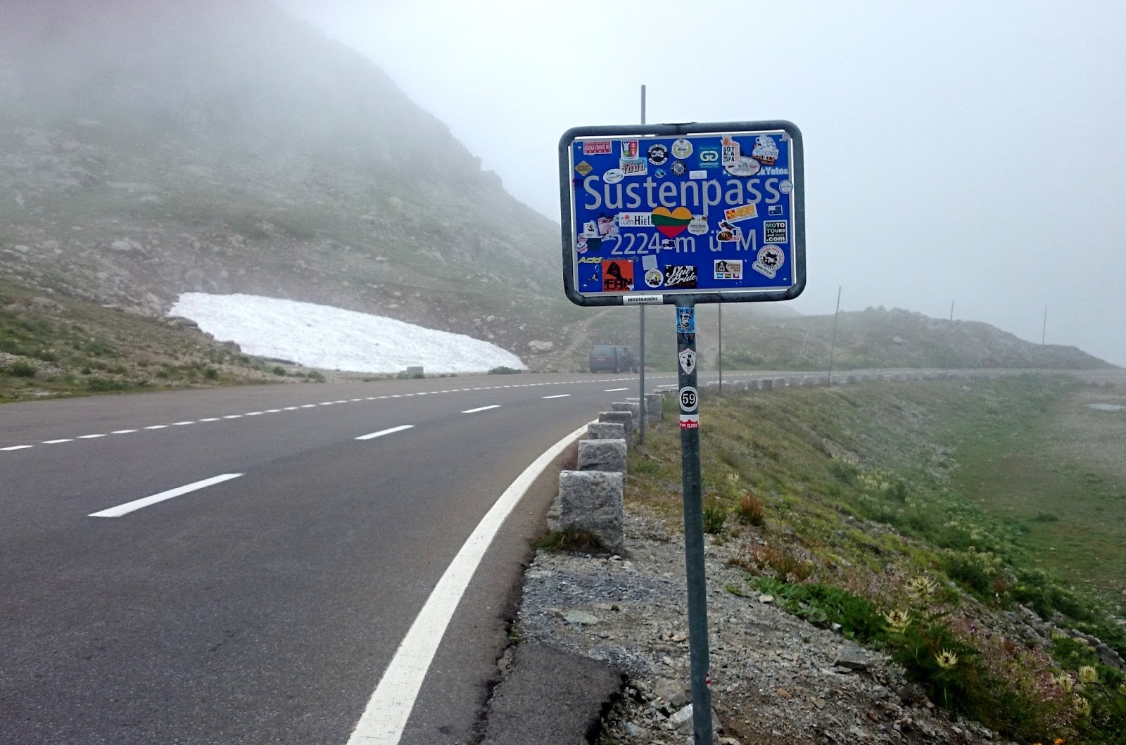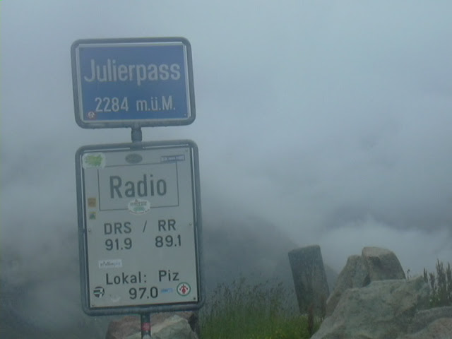 Nuestra ruta hoy nos lleva esta vez a pasar por el Oberalpass, con la cima a 2046 metros de altitud. Imposible hacer fotos, la espesa niebla nos acompaña en la subida y el descenso. Al llegar a Chur decidimos atajar para llegar a nuestro próximo destino que era St. Moritz. ERROR! Esa carretera nos llevo por el puerto de Albulapass a 2315 metros de altitud, comenzamos a pensar que nos habíamos equivocado de año al visitar Suiza. Incluso encontramos nieve. El puerto de Juliarpass a 2.284 metros, al menos, nos deja que fotografiemos el cartel, tal y como hicimos en Sustenpass. En el descenso nos encontramos una autocaravana la única con la que nos cruzamos en todo el día.