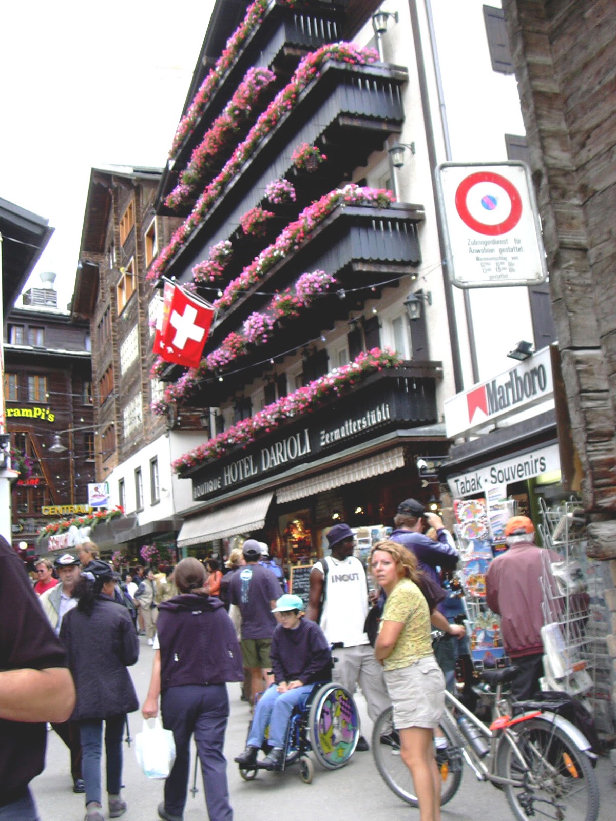Al levantarnos nos ponemos en ruta y nos incorporamos a la autopista A9 y nos desviamos hacia Täsch y vamos directos al camping que lleva el nombre de la localidad, no tiene perdida porque está situado junto a la estación de trenes que suben a Zermatt y por cierto, no está vallado. Nos instalamos y vemos las tarifas 50 francos suizos/dia.  El dueño hablaba perfectamente español y estaba realizando una magnifica maqueta de los Alpes.  Después de comer y dar una vuelta grande a nuestro perro Tejo (un precioso gos d’atura català) nos cogemos las bicis y nos vamos a Zermatt, la carretera tiene un firme horrible y aunque las cuestas son duras, al menos dos de ellas, es recomendable el paseo. En  Zermatt está prohibido el uso del coche, solo se puede acceder andando, en bicicleta, en tren cremallera. En la localidad alpina circulan coches de caballos y también coches eléctricos. Pero, esta pequeña ciudad bien merece tomarse en ella un café.