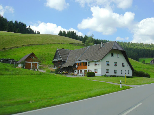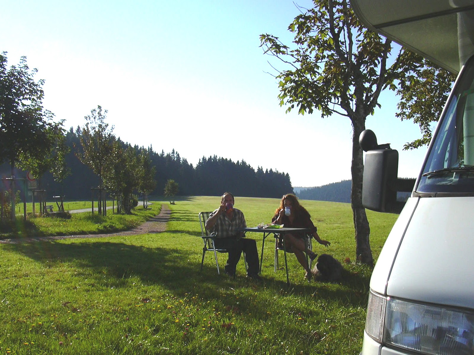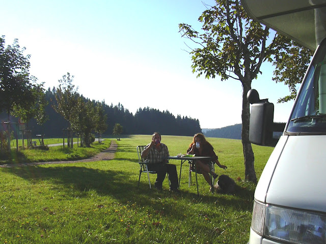 Para dormir decidimos buscar un lugar mas tranquilo y lo hacemos frente a una casona típica de la selva Negra, pedimos permiso a los dueños y nos permiten pernoctar sin problemas. Al día siguiente al levantarnos el desayuno se convierte en un momento único e irrepetible. Tejo disfruto muchísimo de aquello prados.