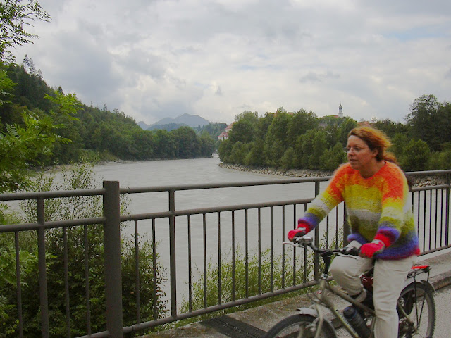 Cogemos las bicicletas para desplazarnos, no llueve y además hay un fenomenal carril bici. Füssen cuenta con infinidad de carriles bicis.   Durante un poco del trayecto vamos paralelos al río Lech que, en algunos puntos,   está completamente desbordado también  recorrimos parte del carril bici del lago  Forggensee.