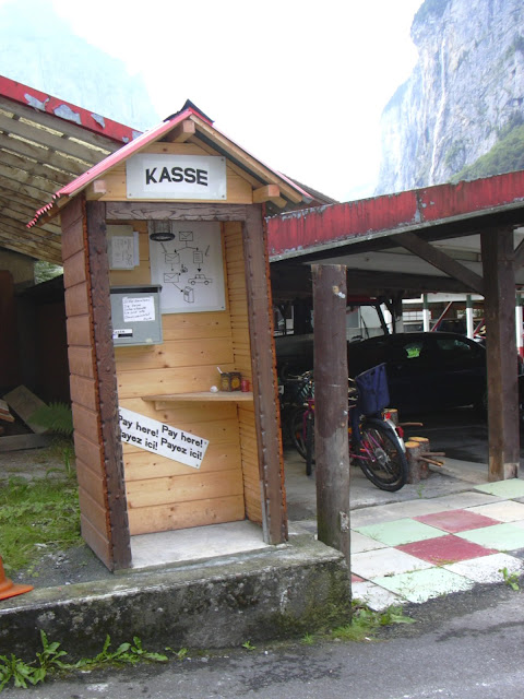 Al levantarnos y después de un gran paseo nos vamos hacia Lauterbaunne, directos al área de autocaravanas, cuesta cinco francos días. Y descubrimos que Suiza es completamente distinto a España, cuando busco donde pagar me encuentro con una pequeña caseta de madera. Como se aprecia en la foto uno mismo tiene que escribir en un sobre la hora de llegada y meter el dinero en un sobre y el sobre, al buzón.  Y VOILA!, allí había sobres, lapiceros, sacapuntas y todo en perfecto estado. Vamos, igual que si estuviese en España.