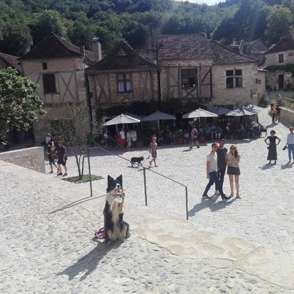 Rocamadour al fondo, el pueblo medieval de los tres niveles, con zona de aparcamientos en la parte más alta, si viajamos con perros MEJOR el área de autocaravanas del robledal, buena temperatura, sombra y lugar para jugar. Buena ruta! 10/07/2020