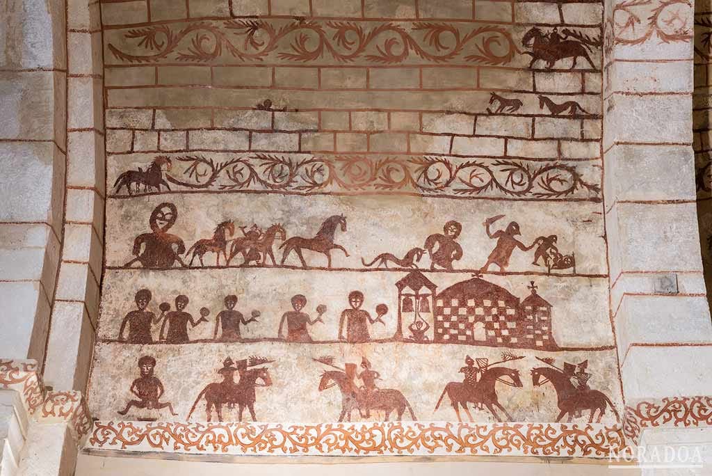 Pinturas que estaban escondidas y que fueron encontradas en el ábside y el presbiterio por el párroco del lugar, él se decidió a raspar las capas de cal existentes, sin duda quería ver si también habría pinturas como en la vecina Gaceo. Y claro que había hasta pintada estaba la pila bautismal. Tesoros que guarda una iglesia románica en un principio pero que cada una de sus restauraciones han ido escondiendo su trazado primitivo.