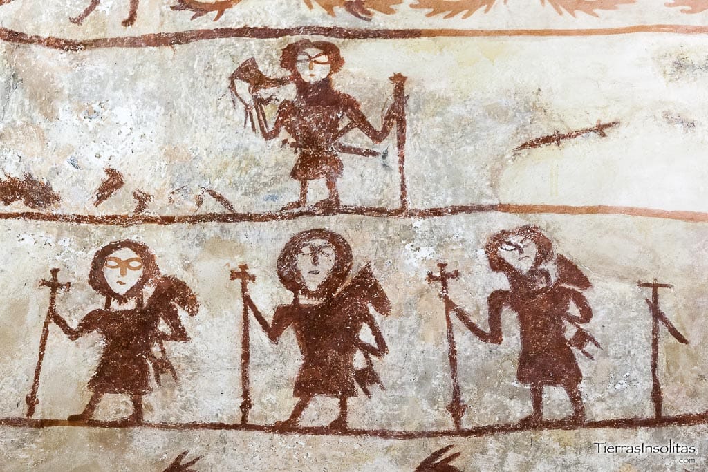 Disfrutar de los frescos de la iglesia de la Asunción de Nuestra Señora de Alaiza es estar viendo escenas de la Edad Media. Pintadas en rojo y negro no verás ningún Cristo en Majestad pero podrás ver lo que sería una representación del asedio a un castillo, donde se ven flechas que vuelan defendiendo a los señores del ataque, también de piedras que son lanzadas como proyectiles. Los asaltantes a caballo parecieran estar a las órdenes de un caballero coronado y que porta un estandarte. Se ven también escenas de cacerías. Una escena que pudiera simbolizar un entierro. Mujeres que caminan al encuentro de otras mujeres. También están representados peregrinos que hacen el Camino…