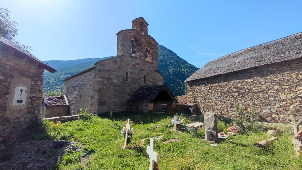 Por carretera y antes del desvío que lleva primero a Boí y luego a Taúll se encuentra uno con un desvío a la izquierda que en poco más de 400 metros te deja en Erill la Vall y en esa pequeña población disfrutar de la maravillosa iglesia de Santa Eulàlia con un magnifico campanario, quizás por eso se habla de él en la leyenda que recorre el valle. Por cierto, leyenda que os contamos en el video que tenemos en nuestro canal de YouTube sobre el valle. Lo cierto es que este campanario, junto con el de San Joan de Boí y Sant Climent de Taúll están perfectamente alineados, una autentica curiosidad. Curiosidad también el ver la escultura de un ladrón sacando la lengua y que es parte del grupo escultórico del Descendimiento de la cruz. En Erill la Vall existe un pequeño aparcamiento a la entrada donde es posible aparcar eso si, en verano conseguir un hueco casi se convierte en un premio de la lotería el encontrarlo.