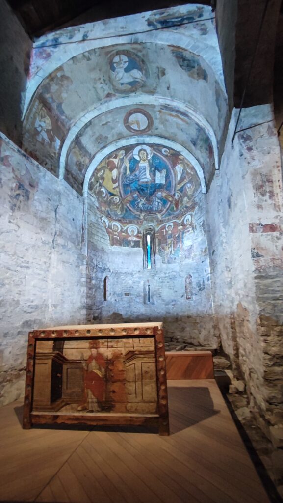 Y por fin llegamos a la que quizás es la joya más valorada del todo Valle de Boí, la iglesia de Sant Climent de Taüll. Su esbelto campanario, sus tres naves y ábsides conforman un conjunto extraordinario. Su imagen de Cristo en Majestad decorando el ábside central ha sido y sigue siendo la imagen del románico del valle de Boí. Sin duda el video que actualmente se proyecta en el interior del video haciendo que veamos como serian aquellas pinturas que veían los habitantes del valle en el siglo XII. En el video del canal tenéis parte de está proyección.