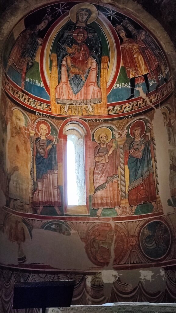 Y ahora si, desde la misma carretera que nos llevaba a Boí donde ya comienza el ascenso que no acabará hasta llegar a la estación de esquí y una vez pasado Boí se llega a Taüll. Una población que llegó a tener hasta tres iglesias y que ahora solo conserva dos pero, que dos. ambas con un maravillosos frescos. Santa Maria de Taúll esta construida dentro del núcleo urbano algo raro en las iglesias y ermitas del valle. Está iglesia fue consagrada un día después que lo fue la de Sant Climent un 11 de diciembre de 1123. Los señores feudales que por los siglos XI y XII dominaban el valle no ahorraron en gastos, los señores de Erill invirtieron muchos recursos en esta comarca. En el ábside central de Santa Aria la figura principal es la Epifania, la Virgen María sujeta al niño en su regazo y los Reyes Magos haciendo sus ofrendas.